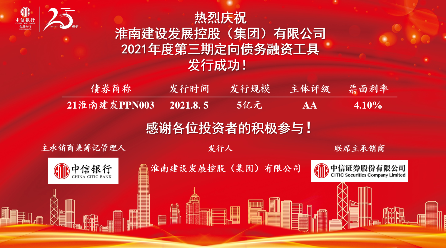 8月5日,淮南建設(shè)發(fā)展控股(集團(tuán))有限公司2021年度第三期定向債務(wù)融資工具(PPN)5億元成功發(fā)行,期限1年,票面利率4.1%。發(fā)行過程中,我公司克服困難,拓展市場,聯(lián)系債券承銷商中信銀行、中信證券,與投資者多次進(jìn)行溝通,保障本期債券成功發(fā)行,票面利率在同業(yè)中處于較好水平。