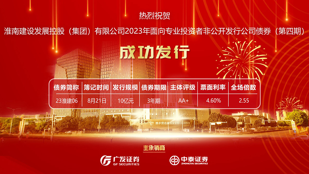 8月21日,淮南建設(shè)發(fā)展控股(集團(tuán))有限公司2023年第四期非公開發(fā)行公司債成功簿記發(fā)行,發(fā)行規(guī)模10億元,全場認(rèn)購倍數(shù)2.55倍,票面發(fā)行利率4.6%。