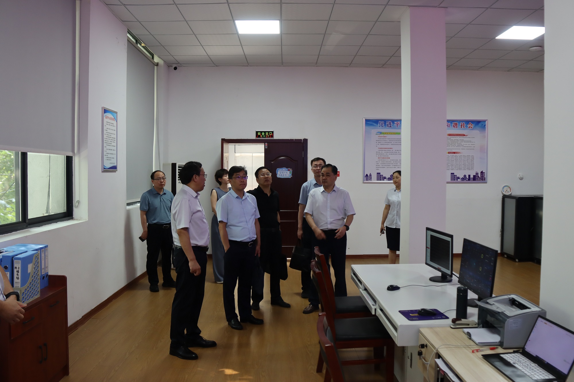 宋道河一行還現(xiàn)場(chǎng)查看了惠群物業(yè)公司服務(wù)大廳遠(yuǎn)程監(jiān)控平臺(tái)及有關(guān)辦公場(chǎng)所。